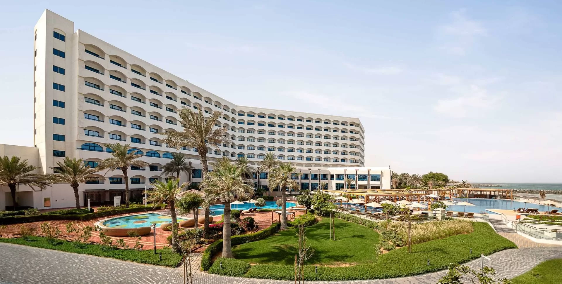 The Ajman Hotel, situated on a private, white sand beach, a large stretch of 400 meters, and the largest one in Ajman, Ajman Hotel managed by Blazon Hotels is your ultimate resort playground. Our rooms and suites well-appointed with modern Arabic décor carry the essence of the orient and offer spectacular views to clear blue waters of the Arabian Gulf. Taking a moment to indulge in magnificent sea-views and airy, lush palm gardens directly from your balcony has a charm on its own; it is a blissful serenity of a kind.
